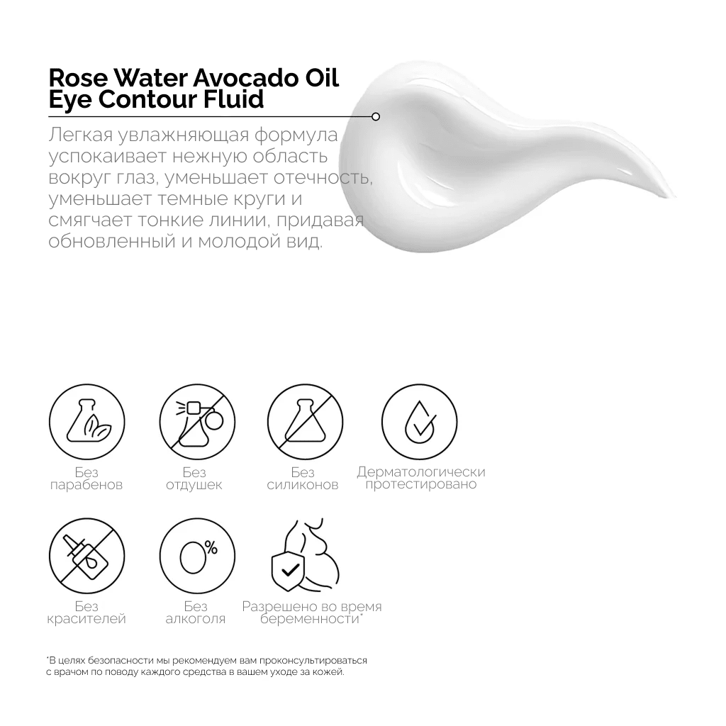Этот глубоко увлажняющий флюид для ухода за кожей вокруг глаз обогащен розовой водой, маслом ши, авокадо и сладкого миндаля, которые предотвращают появление темных кругов под глазами. Он помогает уменьшить отечность и выраженность признаков старения, таких как мелкие и глубокие морщины. Средство имеет легкую текстуру и быстро впитывается. Этот флюид для ухода за кожей вокруг глаз обеспечивает глубокое увлажнение, успокаивает кожу и оказывает антиоксидантное действие. Продукт предназначен для борьбы с обезвоживанием, а также для ухода за уставшей и тусклой кожей.