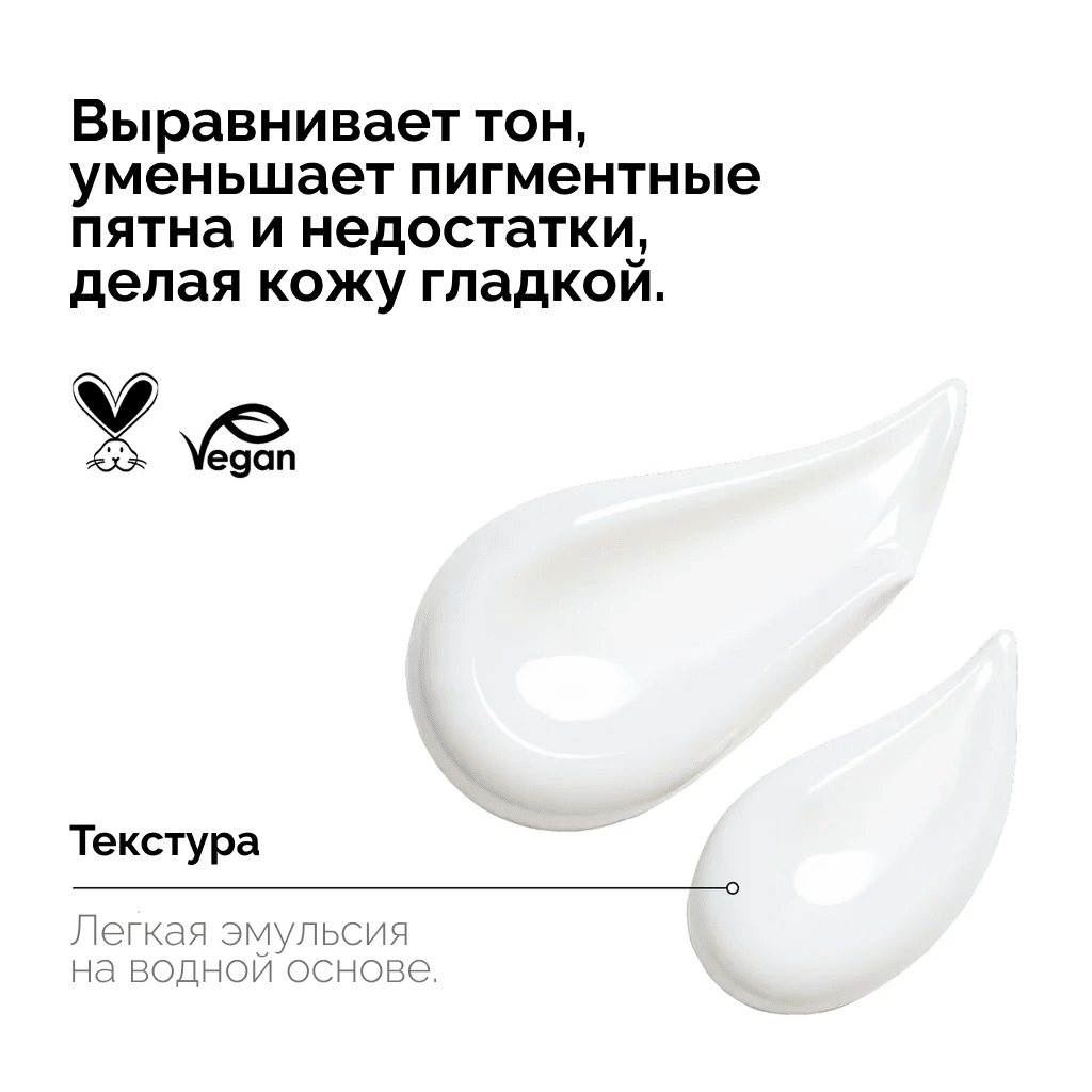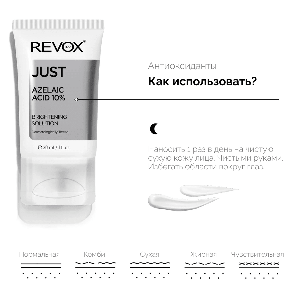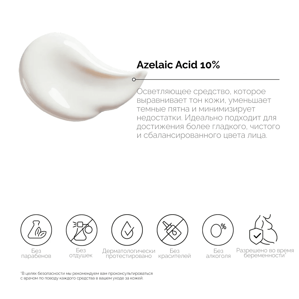 Азелаиновая кислота эффективно уничтожает бактерии, вызывающие акне, что приводит к уменьшению выраженности несовершенств кожи и выравниванию её поверхности. Благодаря своим осветляющим свойствам азелаиновая кислота помогает уменьшить выраженность пигментных пятен и признаков старения, делая цвет лица более чистым и ровным. Средство предназначено для тусклой кожи с неровным тоном, бугорками и пятнами.