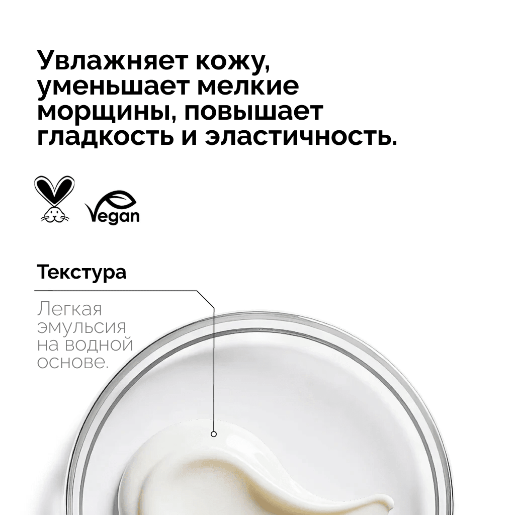Увлажняющий флюид для лица и шеи. Этот продукт сочетает в себе преимущества натуральных увлажняющих компонентов (коллагена, аллантоина и мочевины) с увлажняющими свойствами гиалуроновой кислоты. Небольшой размер молекул коллагена позволяет им проникать в кожу. Этот мощный влагоудерживающий комплекс помогает уменьшить выраженность мелких морщин, делая кожу более гладкой и молодой. Продукт предназначен для устранения видимых признаков старения.