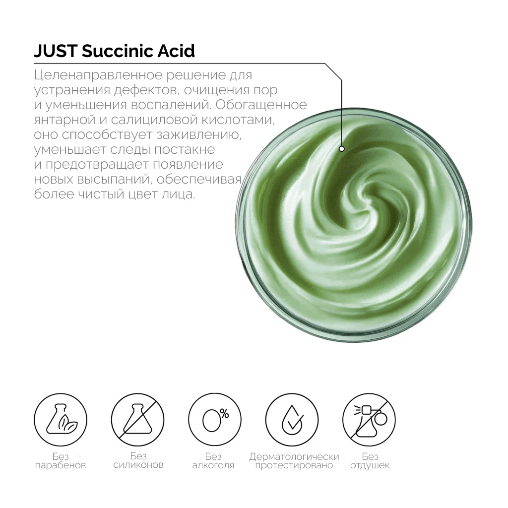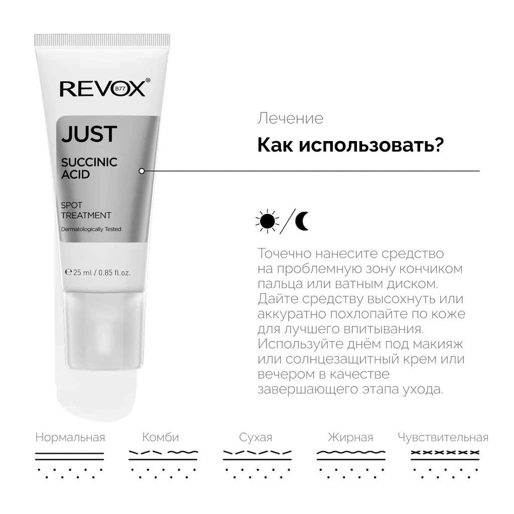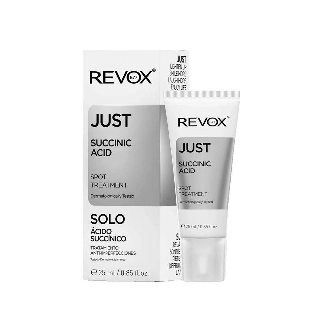 REVOX B77 JUST SUCCINIC ACID SPOT TREATMENT — это раствор для местного лечения высыпаний и пигментных пятен. Прыщи могут появляться из-за избыточной выработки кожного сала и скопления омертвевших клеток кожи, которые закупоривают поры и волосяные фолликулы. 2%-ная янтарная кислота помогает уменьшить воспаление, очистить поры и предотвратить их повторное загрязнение. Это точечное средство, обогащенное соединением серы и салициловой кислотой, способствует быстрому уменьшению воспалений и черных точек, при этом бережно воздействуя на кожу. Оно также усиливает естественные процессы отшелушивания кожи, тем самым устраняя темные пятна после акне. Крем можно наносить под макияж, что позволяет ему воздействовать на проблемную зону, не пересушивая и не вызывая шелушения.