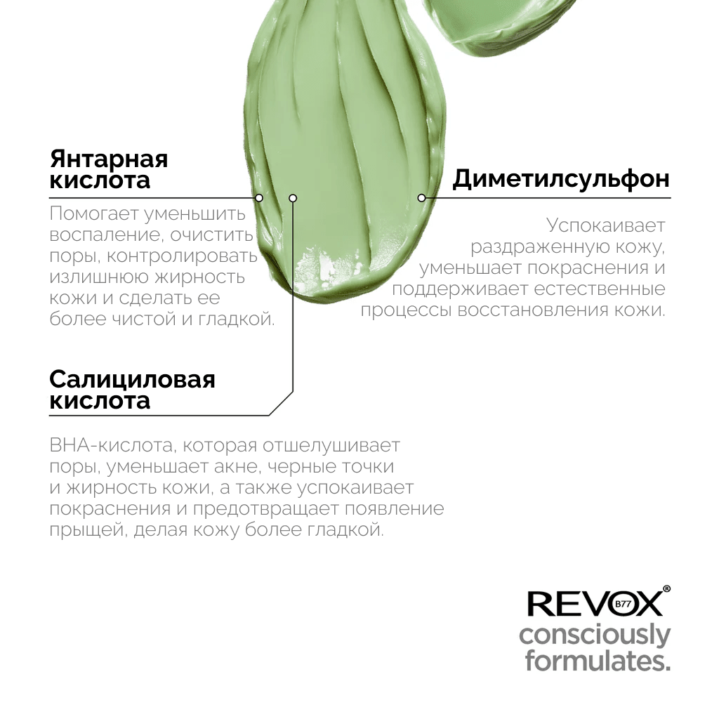 Water / Aqua, Caprylic/Capric Triglyceride, Ethylhexyl Stearate, Octyldodecanol, Glyceryl Stearate, Cetearyl Alcohol, Glycerin, Succinic Acid, Dimethyl Sulfone, Salicylic Acid, PEG-100 Stearate, Ceteareth-20, Ceteareth-12, Cetyl Palmitate, Provitamin B5 / Panthenol, Allantoin, Propylene Glycol, Burdock Root Extract / Arctium Lappa Root Extract, Watercress Flower Extract / Nasturtium Officinale Leaf Extract, Sage Leaf Extract/ Salvia Officinalis Leaf Extract, Sodium Hyaluronate, Phenoxyethanol, Polyacrylate Crosspolymer-6, Potassium Hydroxide, Disodium EDTA, Fragrance / Parfum, Green Dye / CI 77288. Мы постоянно совершенствуем наши рецептуры, поэтому списки ингредиентов, указанные на сайте и на упаковке, могут отличаться в зависимости от времени и региона покупки. Проверьте список ингредиентов на упаковке.