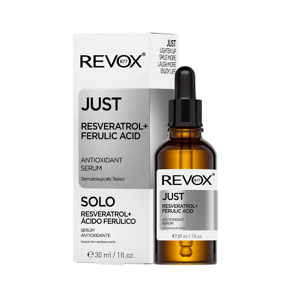 Антиоксидантная сыворотка для лица и шеи. Быстро впитывающаяся увлажняющая формула сочетает в себе два мощных природных антиоксиданта в оптимальной концентрации 1%. Они действуют сообща, защищая кожу от свободных радикалов и борясь с признаками старения. Ресвератрол действует на клеточном уровне, стимулируя синтез коллагена и эластина и укрепляя кожный барьер, делая кожу более гладкой и здоровой. Феруловая кислота повышает эффективность антиоксидантов, а также замедляет появление пигментных пятен и морщин. Средство предназначено для борьбы с неровным цветом лица, шероховатой текстурой кожи, сухостью и покраснениями. Оно подходит для жирной, комбинированной и сухой кожи. Сочетайте с кремом REVOX B77 JUST с витамином С 2%. Не сочетайте с отшелушивающими кислотами.