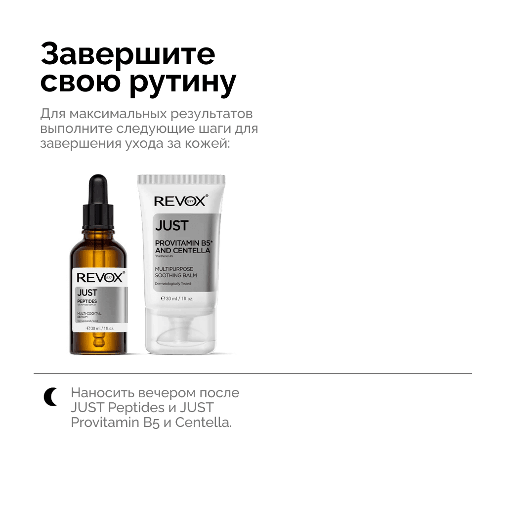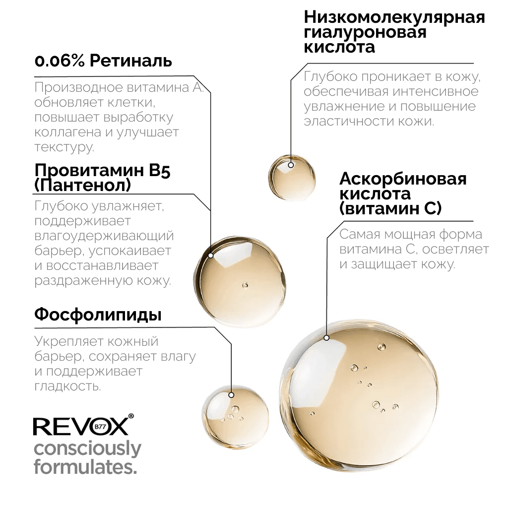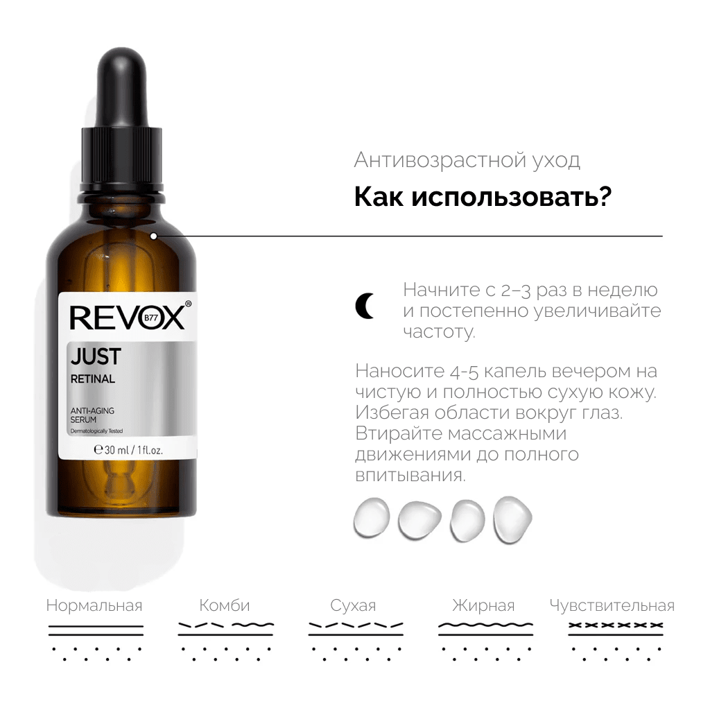 Сыворотка с ретинолом REVOX B77 JUST RETINAL SERUM содержит оптимальное количество инкапсулированного ретинола в концентрации 0,06 % — формы витамина А, эффективность которой в борьбе с преждевременными признаками старения научно доказана. Этот мощный ингредиент влияет на процессы обновления клеток и способствует выработке коллагена, что приводит к улучшению текстуры и тона кожи. Эта нежная формула разглаживает и осветляет кожу, помогает сохранить ее здоровый вид и даже обладает свойствами, полезными для кожи, склонной к акне. Благодаря обновляющему действию ретинола сыворотка помогает удалить омертвевшие клетки кожи и очистить поры, предотвращая появление несовершенств. Не сочетать с: Не сочетать с отшелушивающими средствами и другими продуктами с ретинолом. НУЖНО ЛИ ИСПОЛЬЗОВАТЬ УВЛАЖНЯЮЩИЙ КРЕМ ПОСЛЕ ЭТОГО? Поскольку ретиналь может немного подсушивать кожу, необходимо использовать хороший увлажняющий крем. Мы рекомендуем REVOX B77 JUST с аминокислотами коллагена и гиалуроновой кислотой.