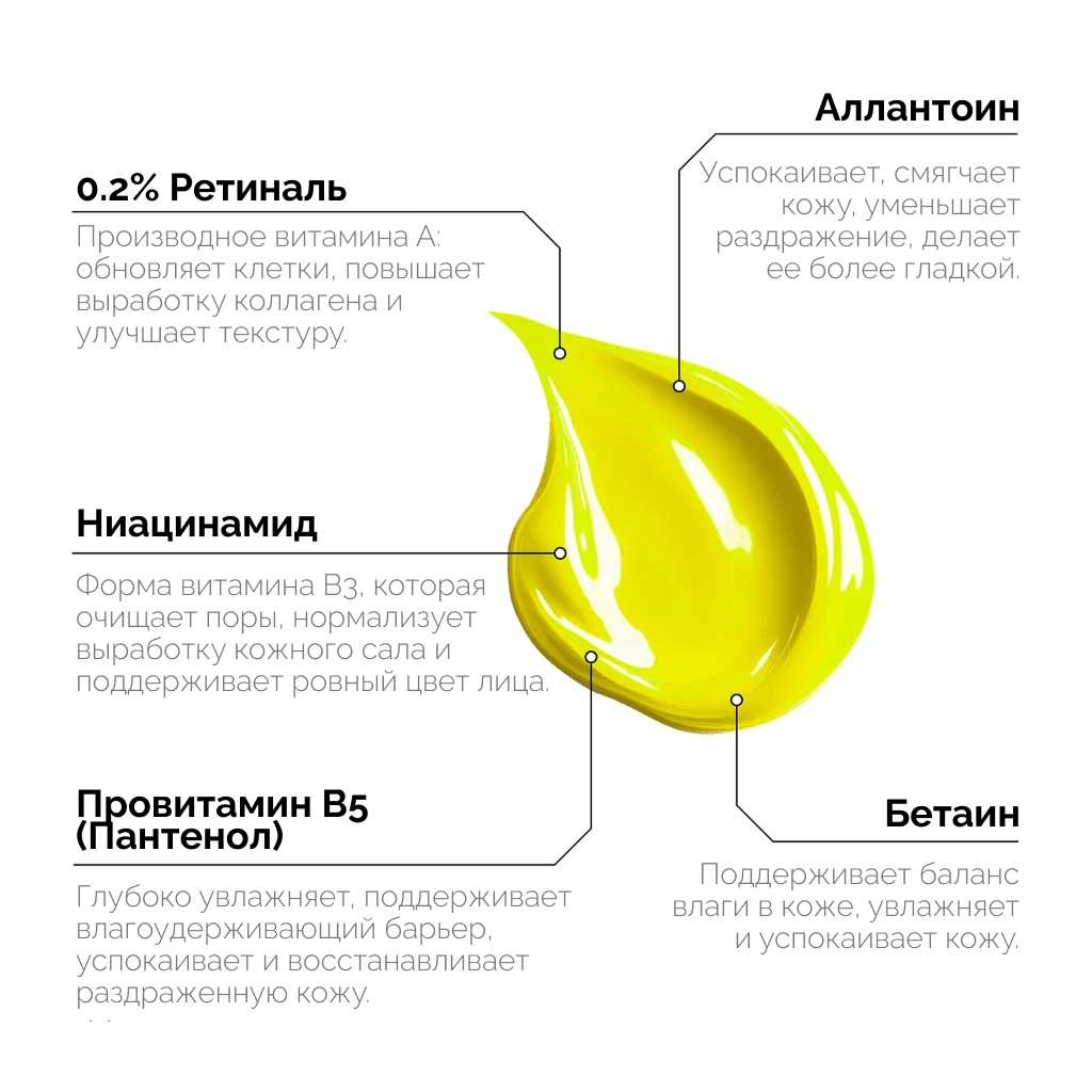 Water / Aqua, Glycerin, Cetearyl Alcohol, Caprylic/Capric Triglyceride, Glyceryl Stearate, Niacinamide, Ceteareth-20, Ceteareth-12, PEG-100 Stearate, Panthenol, Isohexadecane, Betaine, Inulin, Alpha-Glucan Oligosaccharide, Allantoin, Retinal, Cetyl Palmitate, Hydroxyethyl Acrylate/Sodium Acryloyldimethyl Taurate Copolymer, Phenoxyethanol, Hydrolyzed Hyaluronic Acid, Coenzyme Q10/Ubiquinone, Tocopheryl Acetate, Bisabolol, Disodium EDTA, BHT. Мы постоянно совершенствуем наши рецептуры, поэтому возможны различия в списках ингредиентов, указанных на сайте и на упаковке, в зависимости от времени и региона покупки. Проверьте список ингредиентов на упаковке.