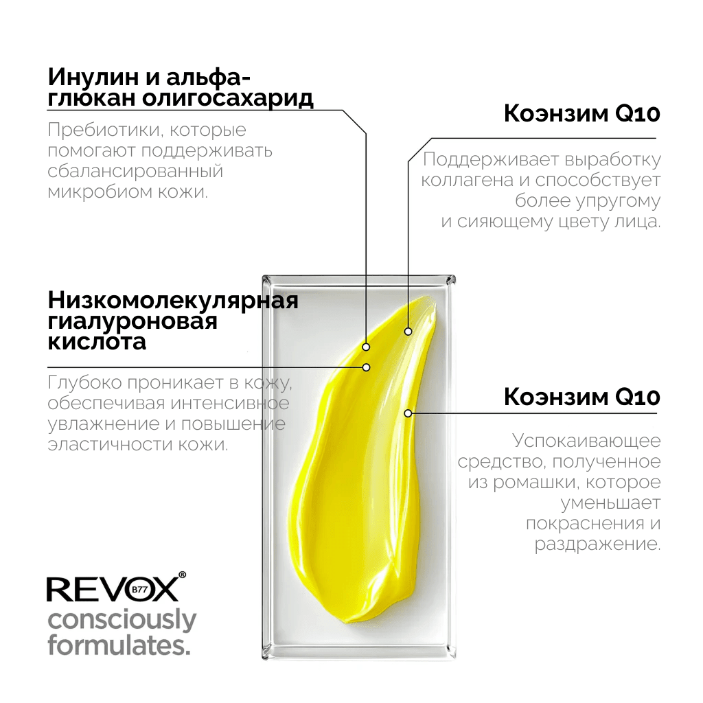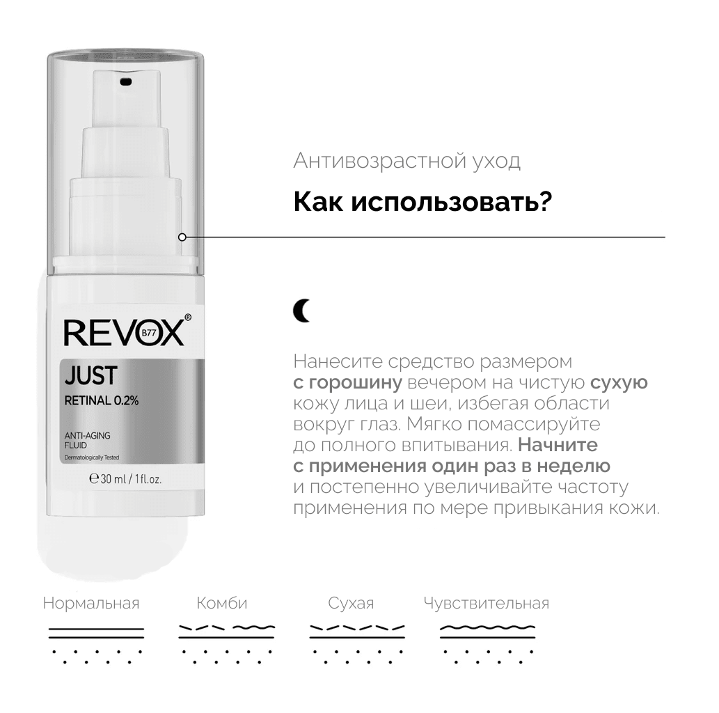 Высокоэффективная формула с ретиноидами. Ретиналь — мощный ингредиент, эффективность которого в борьбе с преждевременными признаками старения научно доказана. Благодаря оптимальной концентрации ретиналь стимулирует выработку коллагена, благодаря чему кожа становится более упругой и эластичной, а морщины и заломы — менее заметными. Он помогает уменьшить выраженность пигментных пятен, делая кожу более ровной, гладкой и сияющей. Ретиналь борется с акне и полезен для жирной и склонной к акне кожи, а также для всех остальных типов кожи. Обогащен ниацинамидом и пантенолом, которые снимают раздражение, сохраняя при этом оптимальный уровень увлажнения. Этот продукт рекомендуется опытным пользователям ретиноидов. Если вы новичок, мы рекомендуем начать с сыворотки REVOX B77 JUST Retinal Serum и постепенно увеличивать частоту использования, пока ваша кожа не будет готова к более высокой концентрации. Не используйте с другими ретиноидами или прямыми кислотами!