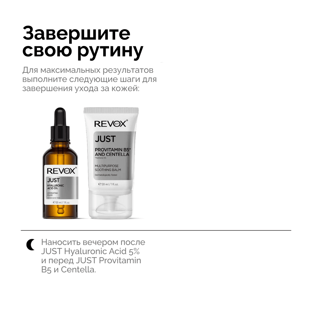 Для достижения наилучших результатов наносите его после увлажняющей сыворотки, например REVOX B77 с гиалуроновой кислотой 5 % или REVOX B77 JUST с полиглутаминовой кислотой, и перед нанесением увлажняющего крема. Вы также можете использовать метод «ретинального сэндвича»: наносите тонкий слой REVOX B77 JUST с провитамином B5 и центеллой до и после применения ретинола, чтобы уменьшить раздражение и увлажнить кожу.